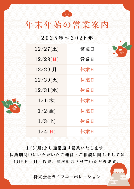 2025年12月27日から2026年1月4日までの年末年始は休業とさせていただきます。