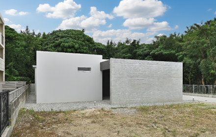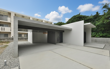 打ち放しコンクリート×白壁のコントラストが周囲の緑に映える、床面積約30坪の邸宅。